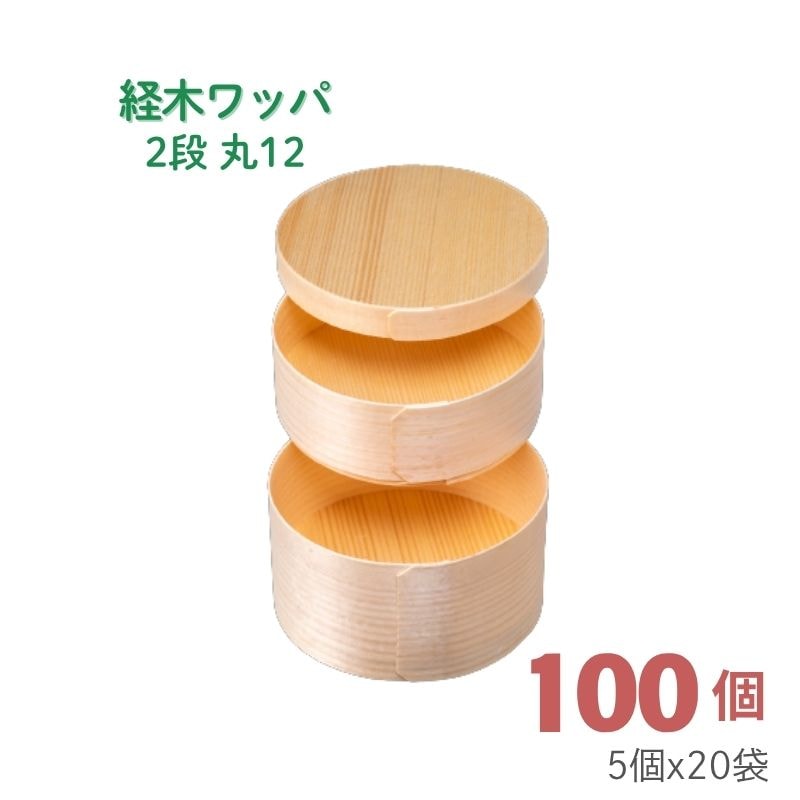 | 5644 | 経木ワッパ 2段 丸12 | 100 | 上段:φ120×H45㎜、あげ底<10㎜> 下段:φ120×H62㎜、あげ底<12㎜> |